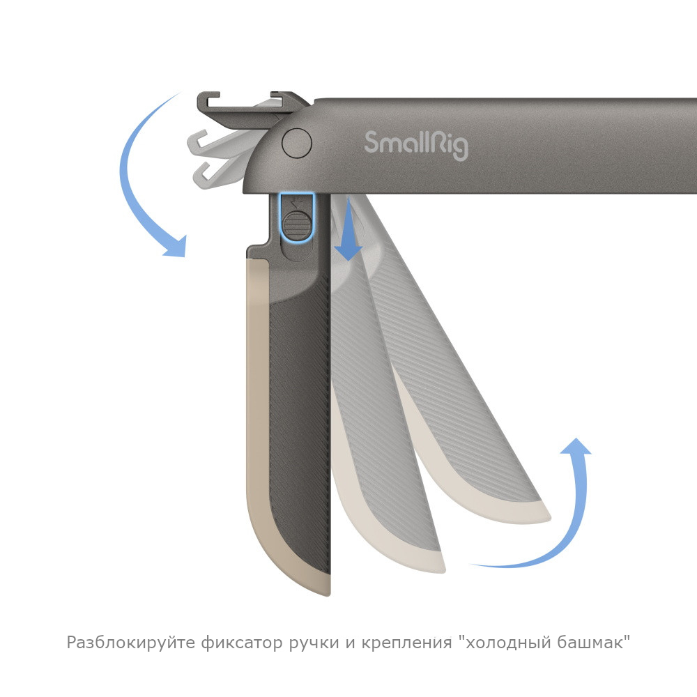 Для крепления необходимых для съемки устройств и аксессуаров на держателе предусмотрены два разъема «холодный башмак», а для установки на штатив - резьба 1/4". В разложенном виде ручки и разъемы «холодный башмак» имеют надежную механическую фиксацию. С помощью поворотного узла крепления смартфона можно легко переходить от горизонтального к вертикальному положению кадра.