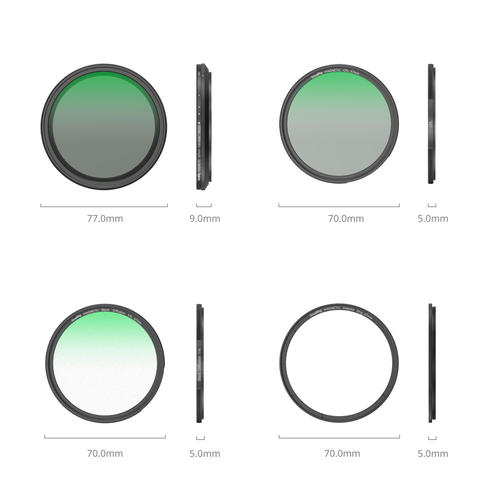 Комплект совместим с клетками для смартфонов SmallRig, которые поддерживают установку магнитного переходного кольца 67 мм.С помощью входящего в комплект переходного кольца фильтры могут быть установлены на объективы фото и видеокамер с диаметром 67 мм.