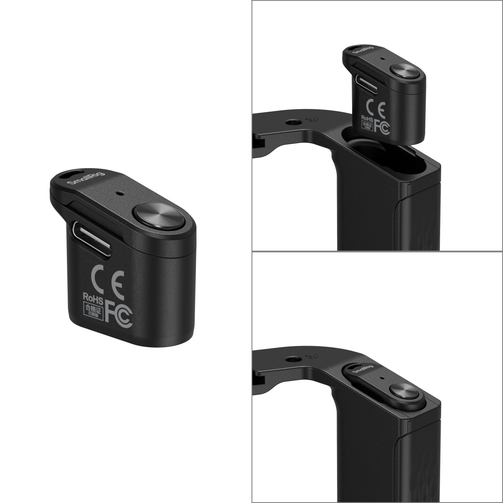 Однократное нажатие кнопки запускает фотосъемку или видеозапись, в зависимости от режима камеры. Для экономии энергии контроллер автоматически выключается через 5 минут после отключения от сопряжения или через 30 минут бездействия после сопряжения. Во время зарядки постоянно горит красный светодиод, указывающий на активный ввод энергии, а зеленый светодиод гаснет; красный свет гаснет при полной зарядке.